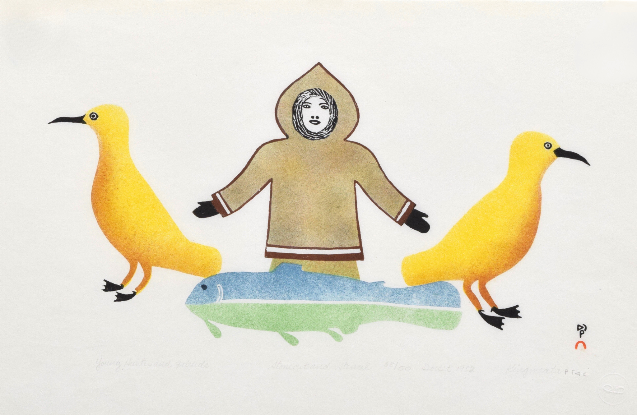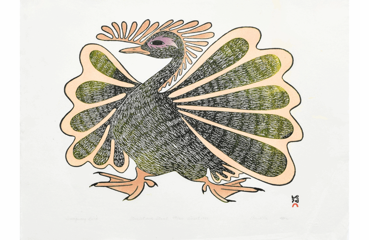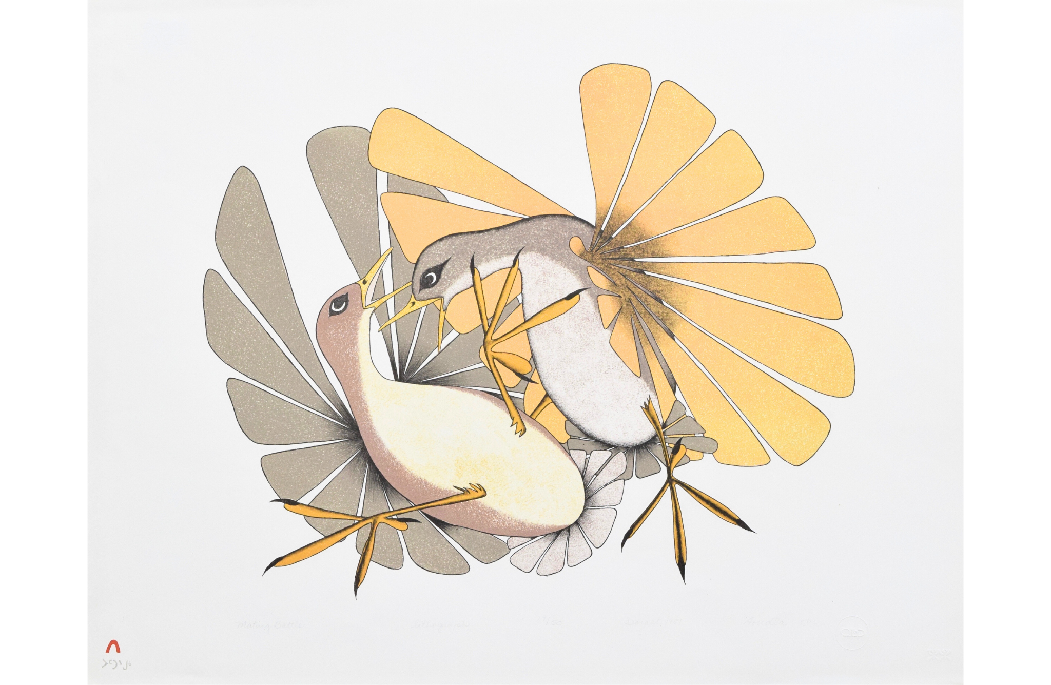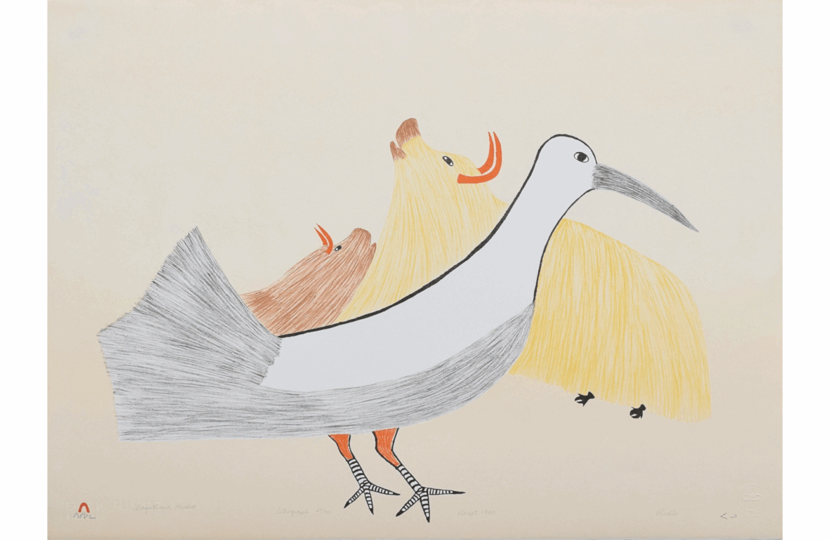 The third and final instalment in our summer sale series brings together 20 Inuit prints devoted to birds. Some of the images portray birds as their sole subject. Others picture birds in the presence of other animals or humans. A few of the images incorporate forms of northern architecture such as buildings and summer tents. Often whimsical in their conception, these brightly decorative prints express exuberance and joy, reflecting the important and complex role that birds play in Inuit culture and spiritual life.