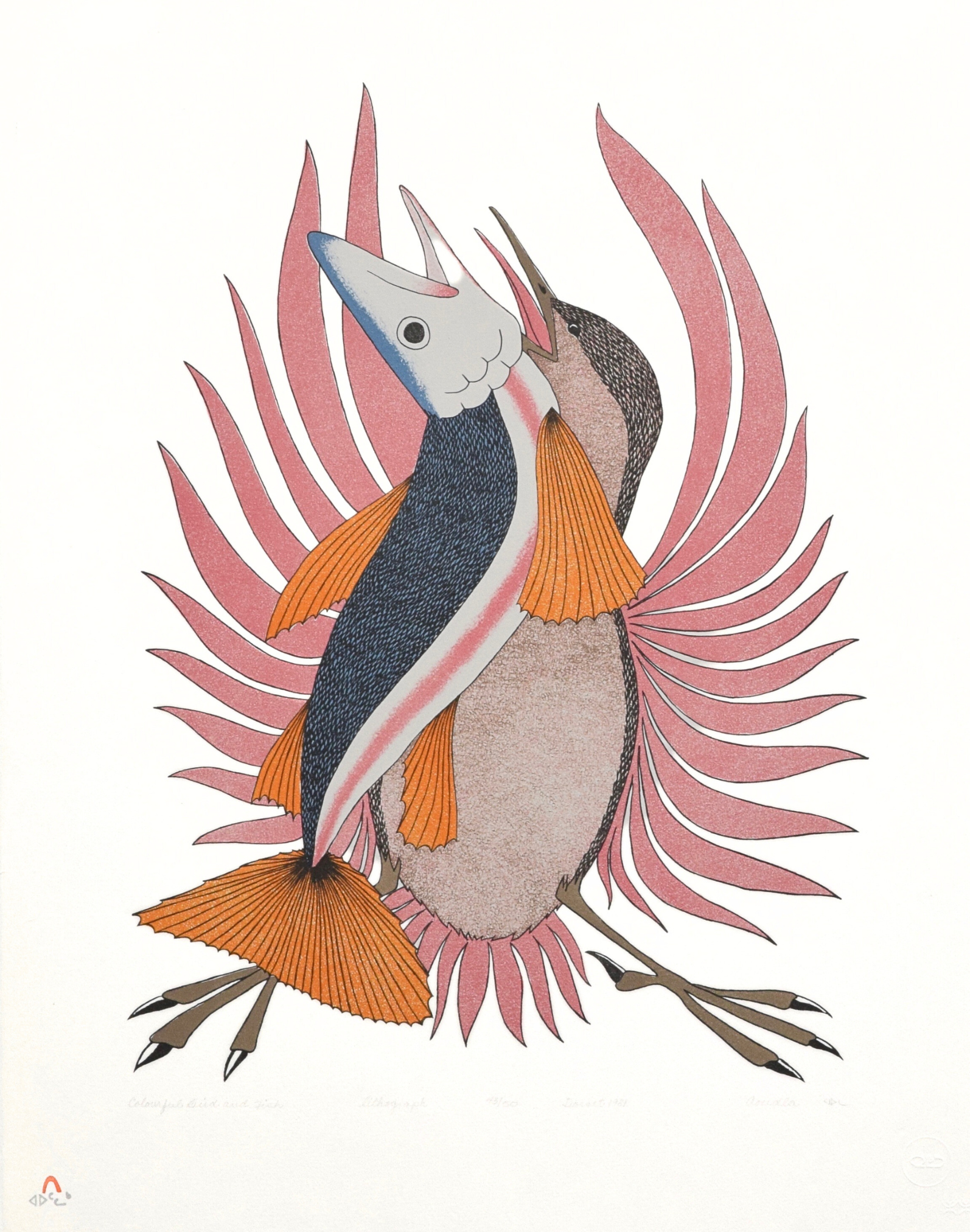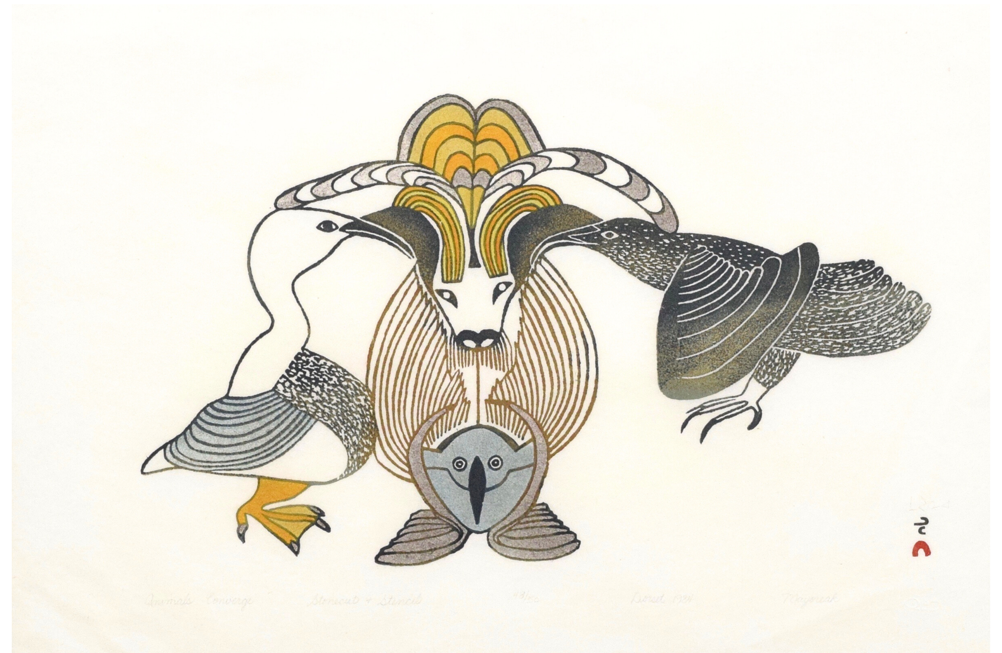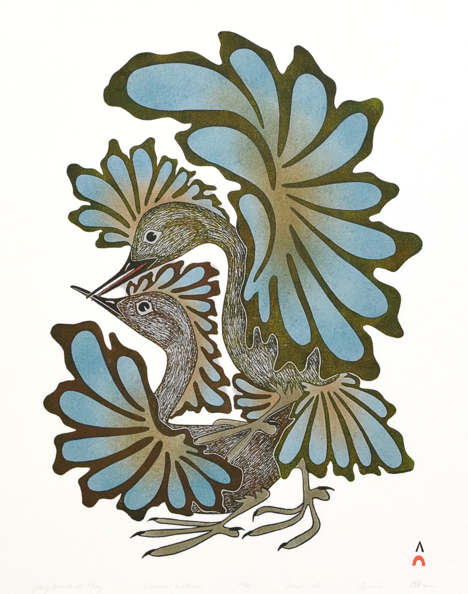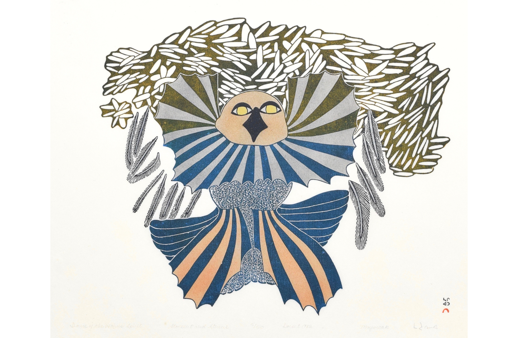 The third and final instalment in our summer sale series brings together 20 Inuit prints devoted to birds. Some of the images portray birds as their sole subject. Others picture birds in the presence of other animals or humans. A few of the images incorporate forms of northern architecture such as buildings and summer tents. Often whimsical in their conception, these brightly decorative prints express exuberance and joy, reflecting the important and complex role that birds play in Inuit culture and spiritual life.