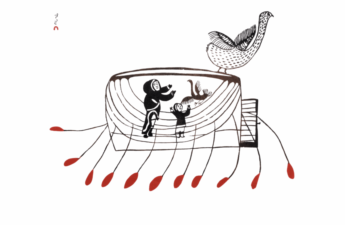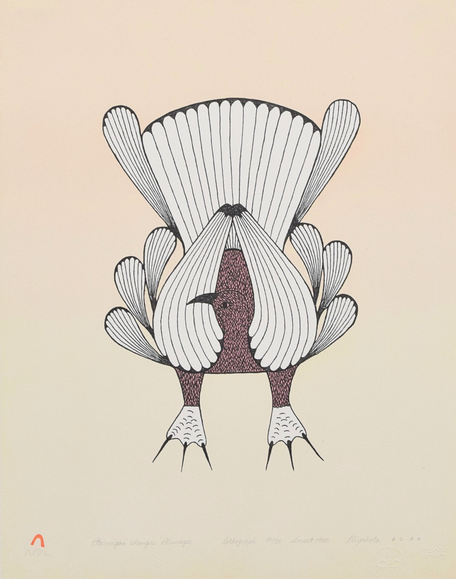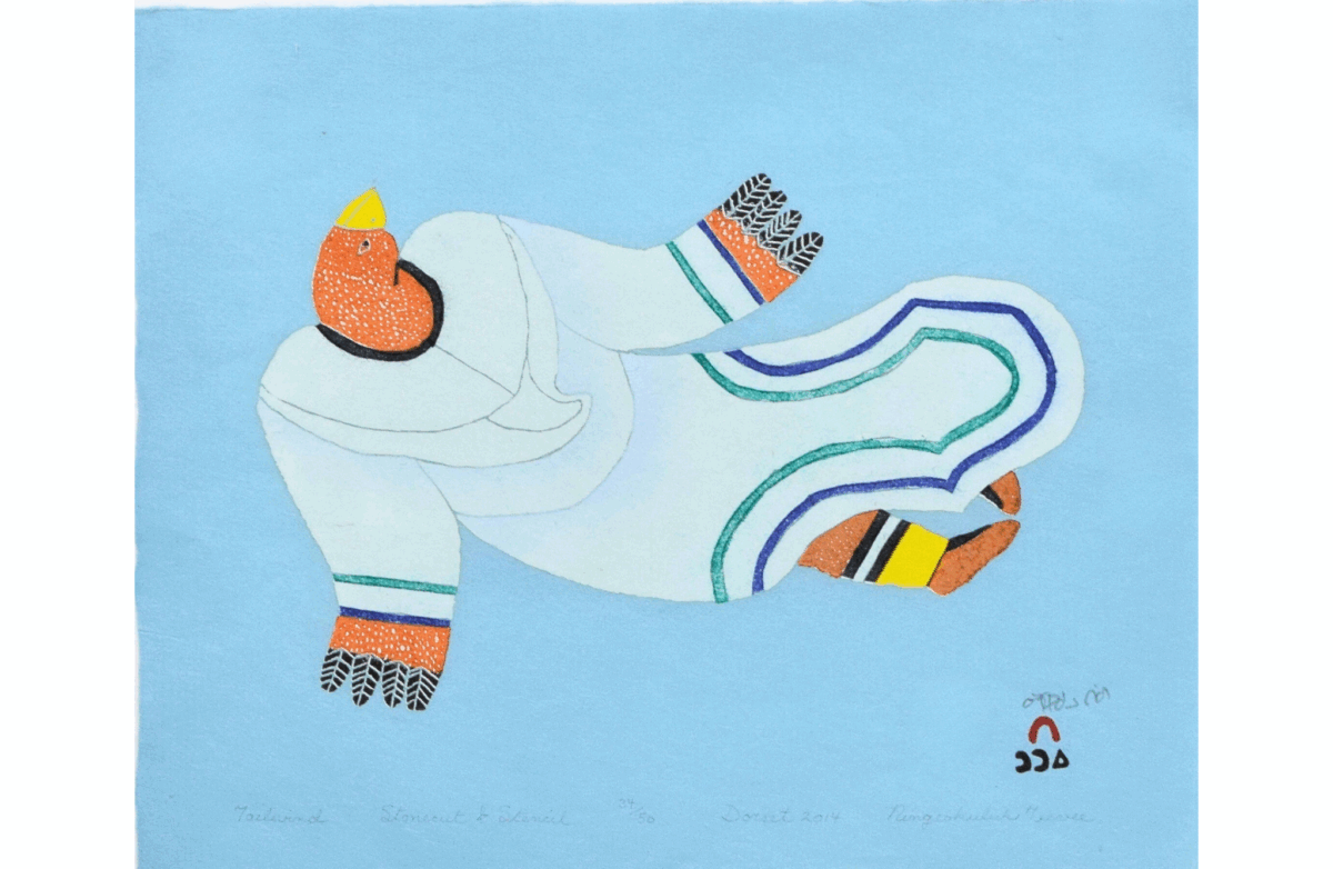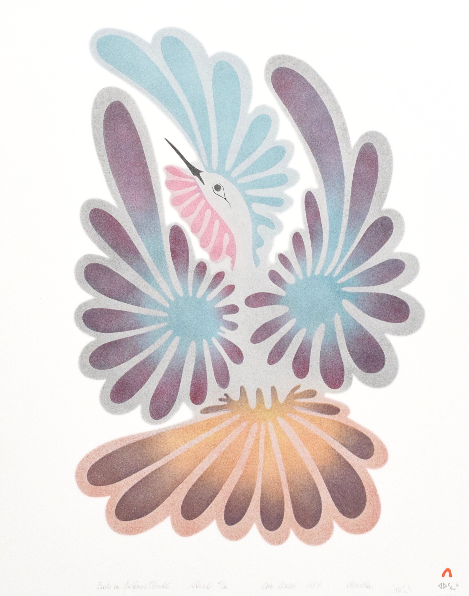 The third and final instalment in our summer sale series brings together 20 Inuit prints devoted to birds. Some of the images portray birds as their sole subject. Others picture birds in the presence of other animals or humans. A few of the images incorporate forms of northern architecture such as buildings and summer tents. Often whimsical in their conception, these brightly decorative prints express exuberance and joy, reflecting the important and complex role that birds play in Inuit culture and spiritual life.