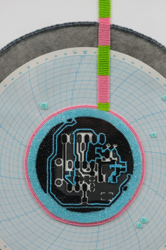 Flux, 2017, Beads, porcupine quills, water flow chart, circuit, board schematic on paper, 41 3/8 x 29.5 in. (paper) SOLD